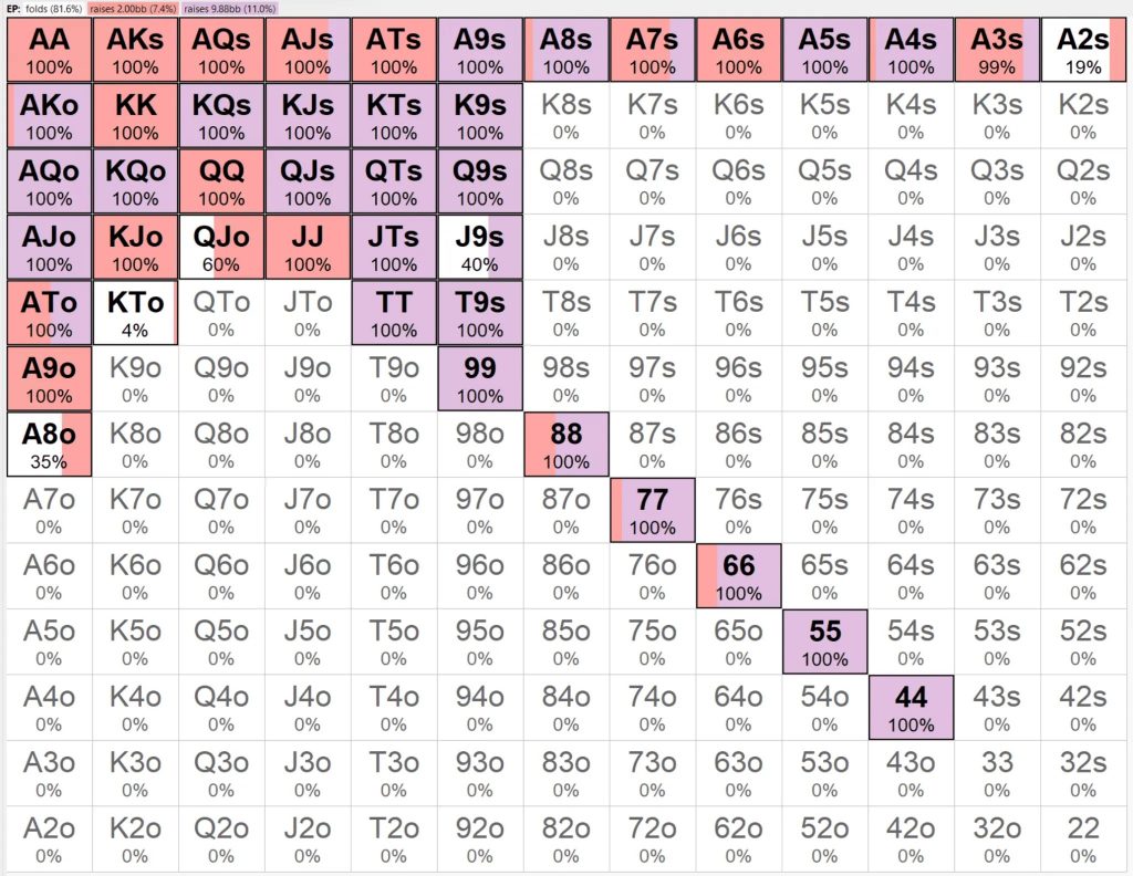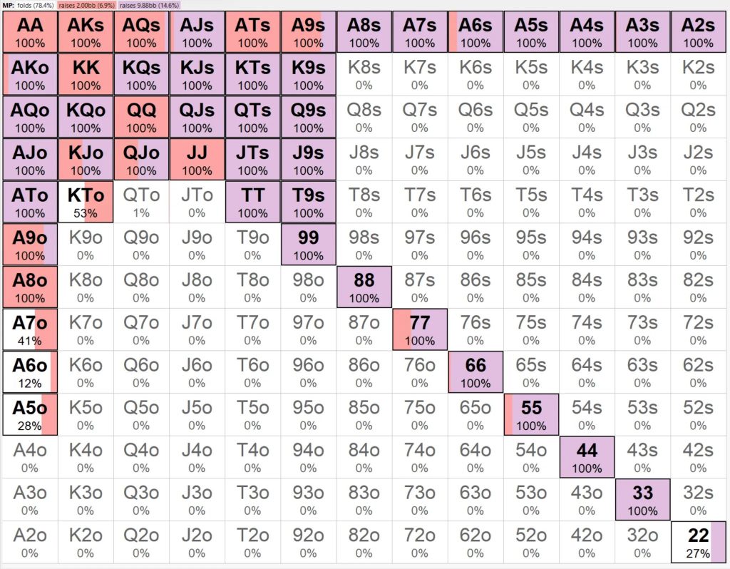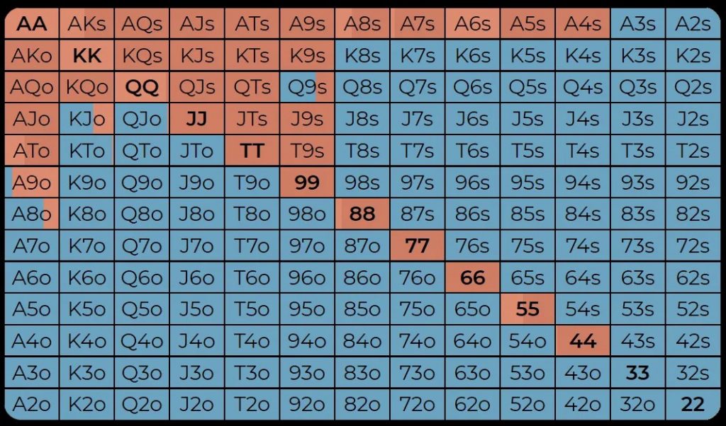 Помните, что на ранних позициях следует пушить с относительно узким диапазоном, а по мере приближения к баттону/малому блайнду — с более широким диапазоном.