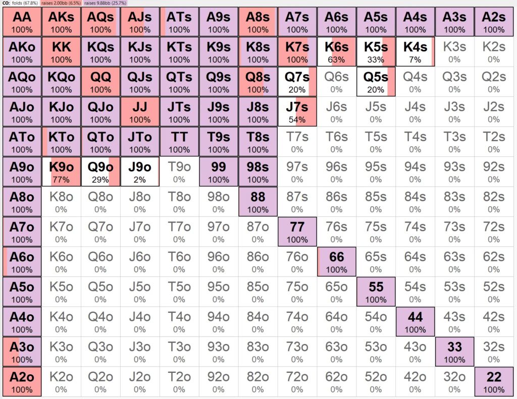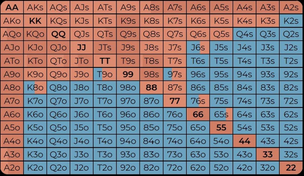 Примечание: UTG/UTG+1, MP/Lojack и CO/BTN объединены в одну группу, поскольку диапазоны пуш-фолда для этих пар практически идентичны.