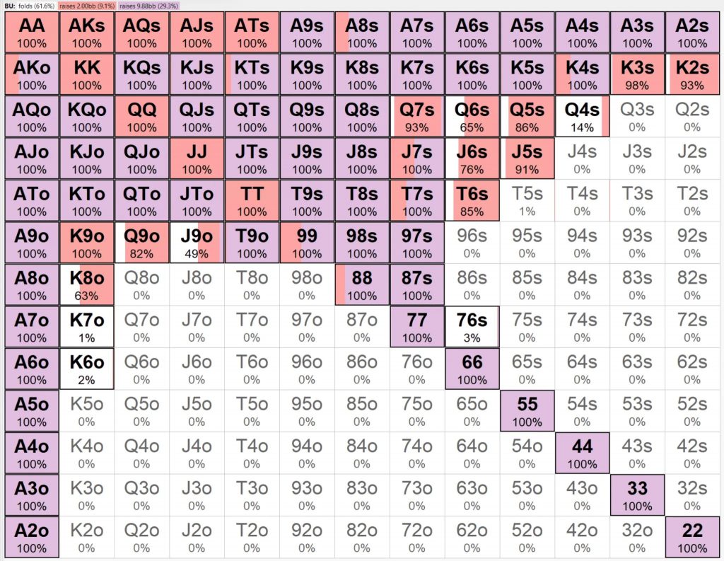 Благодаря возможности использования минимального рейза, BTN может открывать более чем в 2 раза больше рук — это соответствует результатам расчетов chipEV Lucid Poker и HRC.