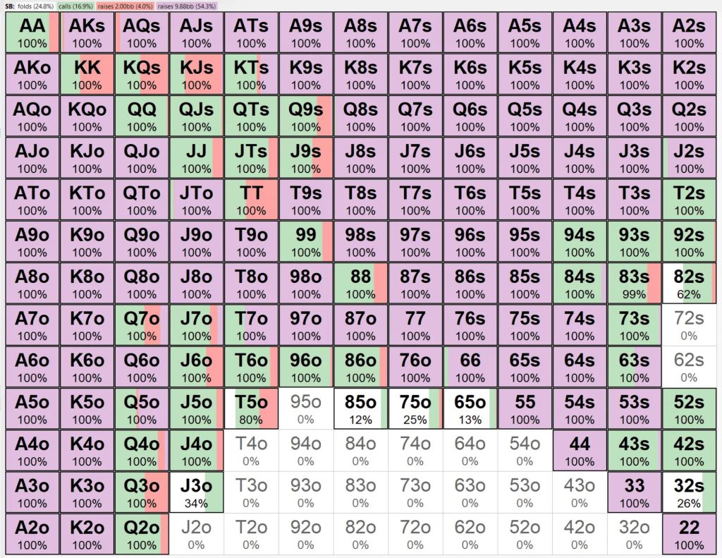 Включив в доступные опции колл, рейз и олл-ин (результат HRC), а также учитывая ICM, малый блайнд может разыгрывать диапазон в 75,2%. Исключение бинарного варианта делает розыгрыш большего количества рук прибыльным.