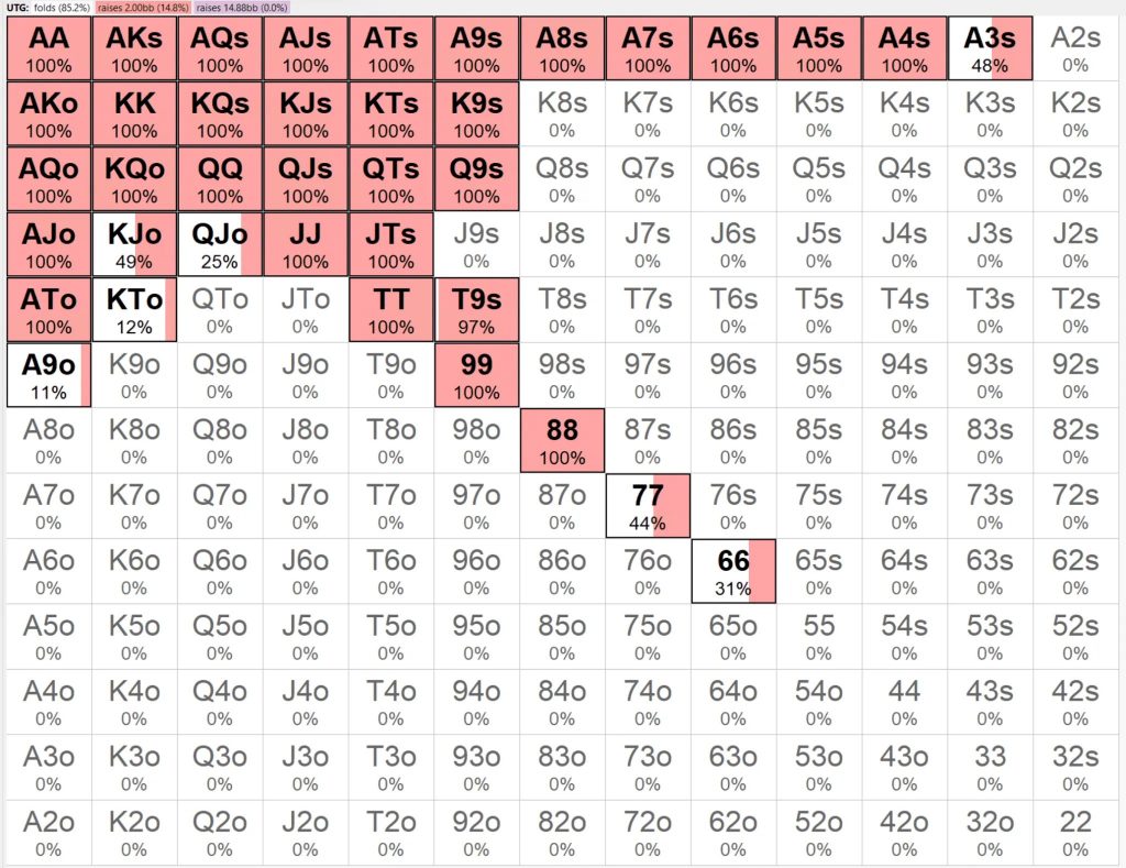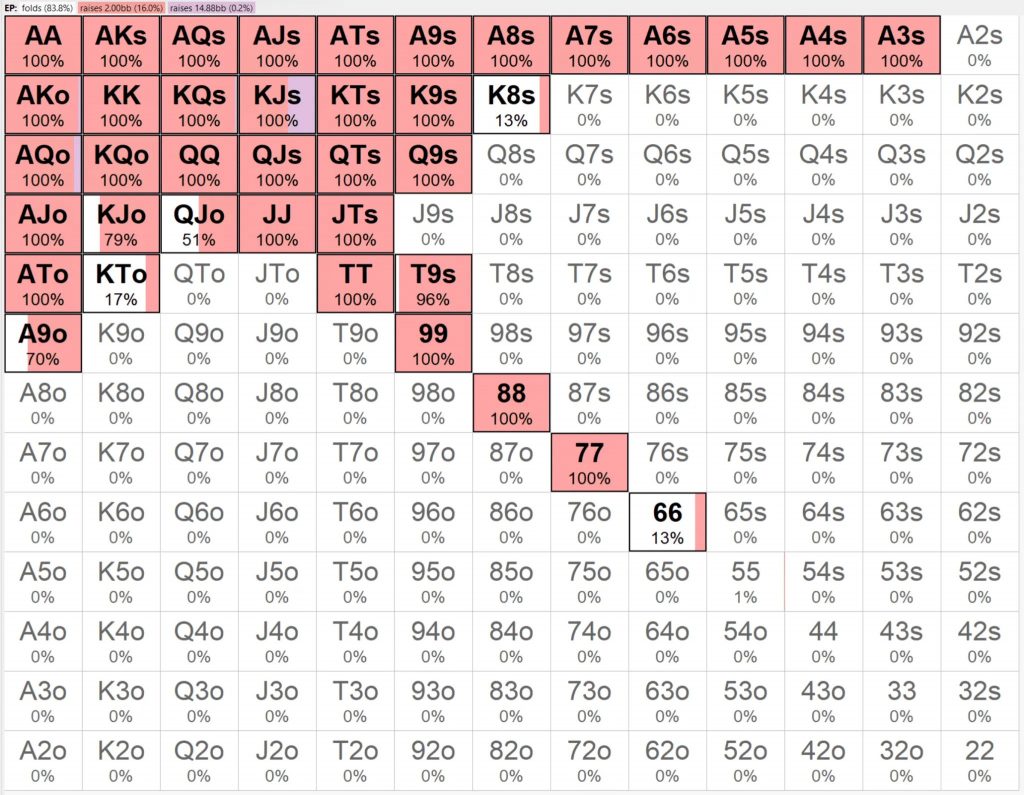 Благодаря использованию минимального рейза, решение Lucid GTO chipEV позволяет UTG разыгрывать 17% рук, примерно на 30% больше рук, чем в решении chipEV пуш-фолд.