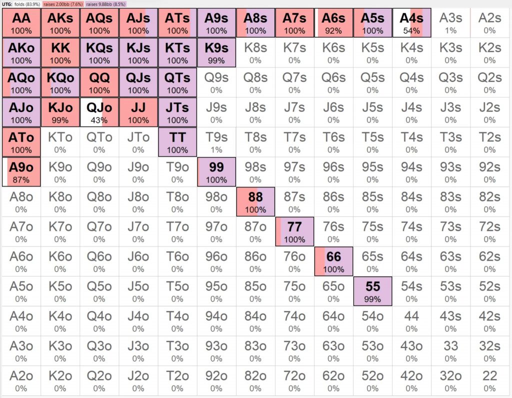 Как правило, нам нужен более сильный диапазон пуша из UTG, поскольку, если кто-то сделает колл, у него, скорее всего, будет более сильный диапазон, так как у вас также будет более узкий/более сильный диапазон.