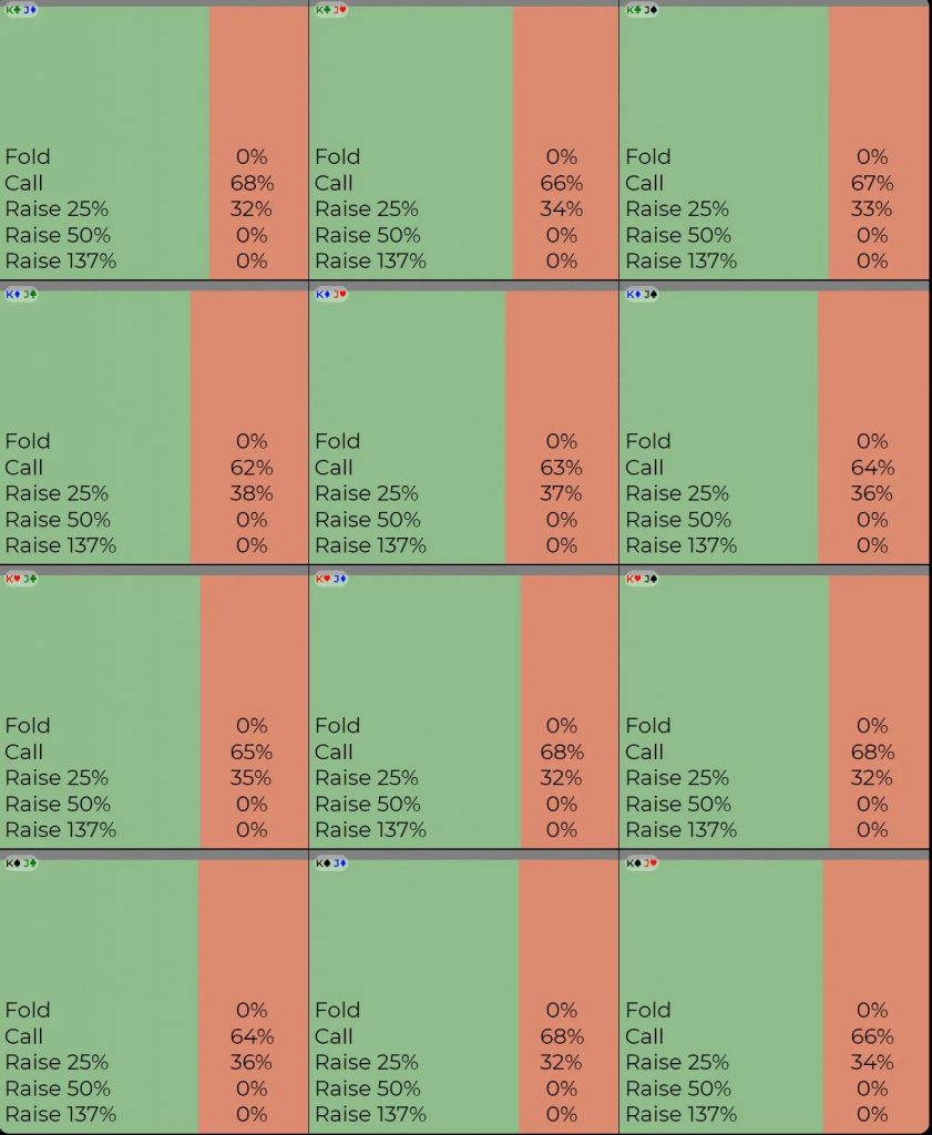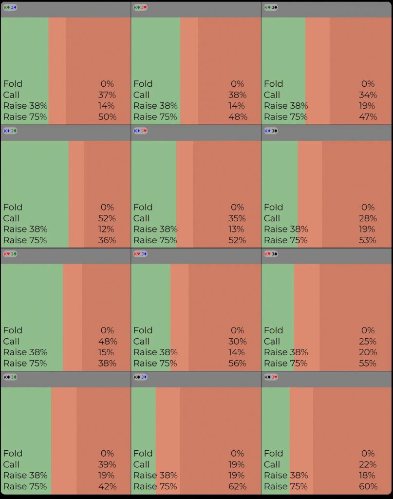 Когда у вас сильная рука и вы сталкиваетесь с крупной ставкой, вы заметите в подходе солвера более частое использование слоуплея — чем больше ставка, тем чаще применяется эта тактика.