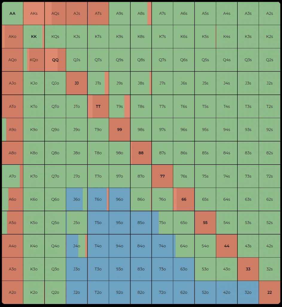 При глубине в 20 больших блайндов стратегия претерпела изменения по сравнению со стратегией при глубине 50 больших блайндов.