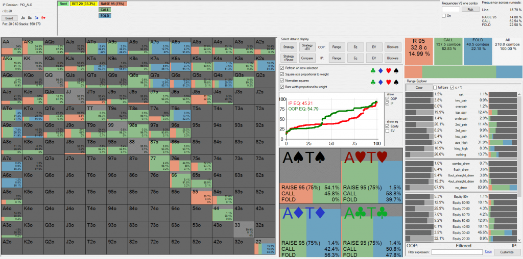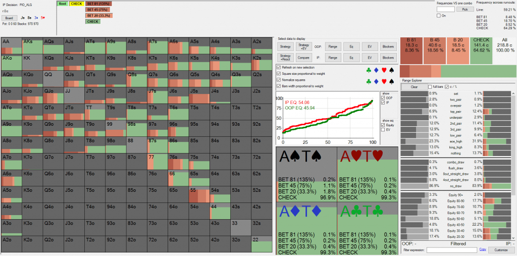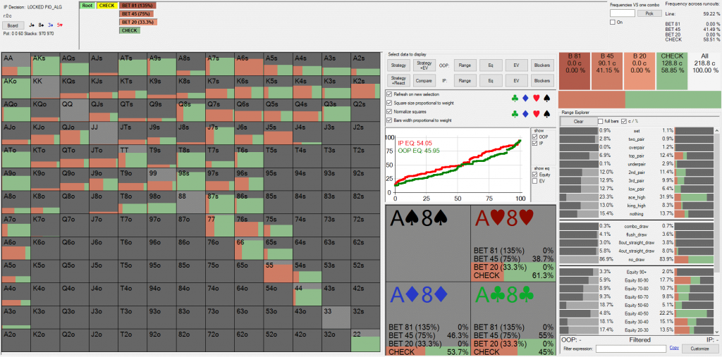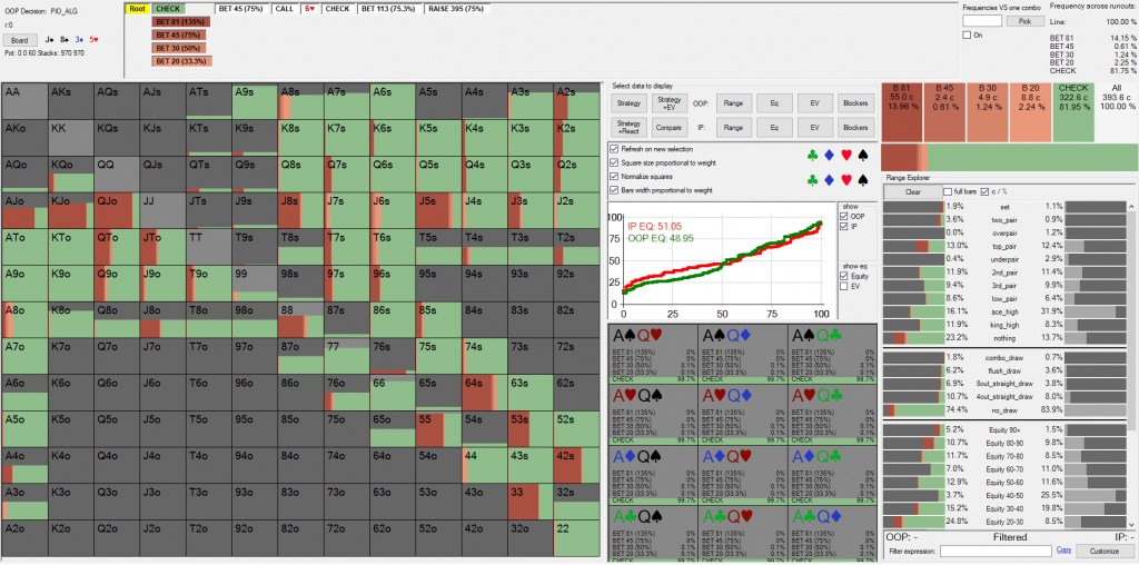 Мы видим, что оптимальный размер ставки сводится к простой стратегии «овербет или чек», а частота ставок падает с 41% до всего лишь 18%.