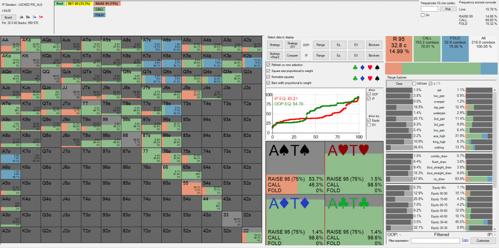 Более того, состав диапазона существенно меняется. В модели GTO солвер использовал 66% блефов, строя свой диапазон бета. В этой оптимизированной версии этот показатель снижается до 43%.