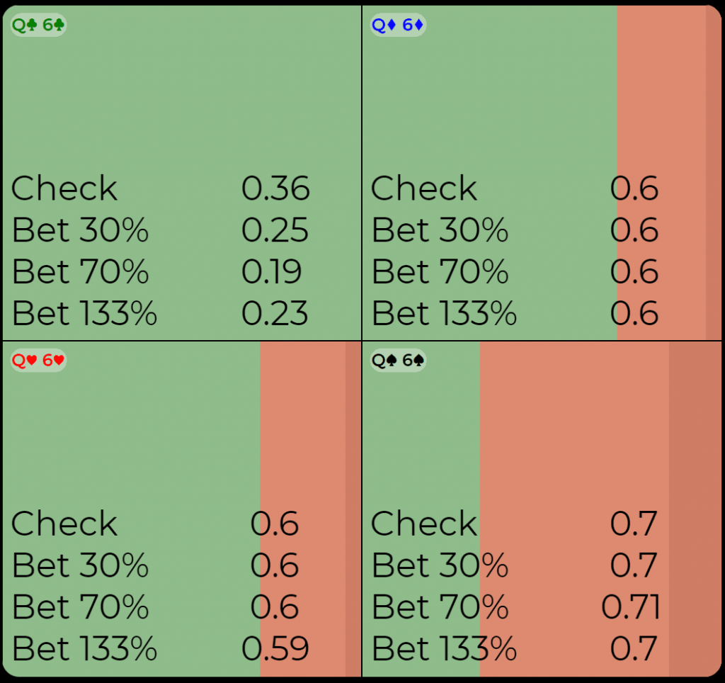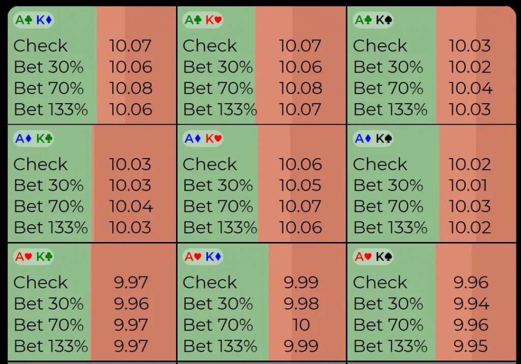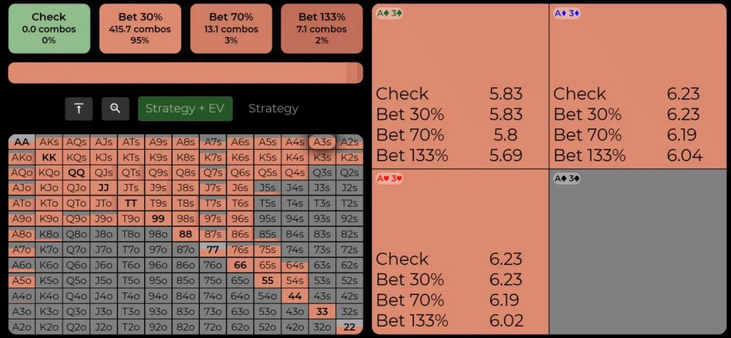 Солвер использует этот подход баттона при столкновении с чеком для разделения диапазона катоффа на чек-колл и чек-рейз. Например, A3 — чек-колл, AK — чек-рейз.