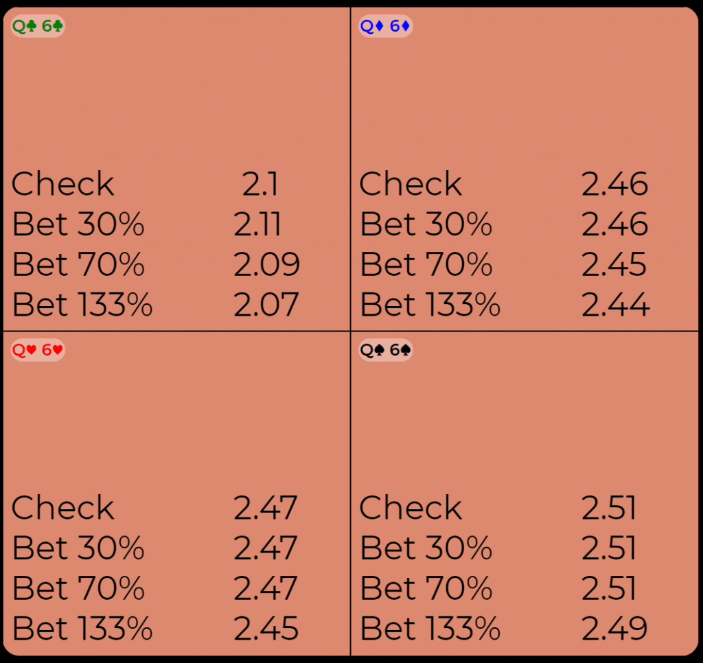 Выше вы можете увидеть, как сильно позиция влияет на математическое ожидание нижней части диапазона. В позиции Q6s стоят как минимум 2,1 больших блайндов. Без позиции — максимум 0,71.