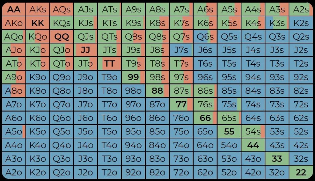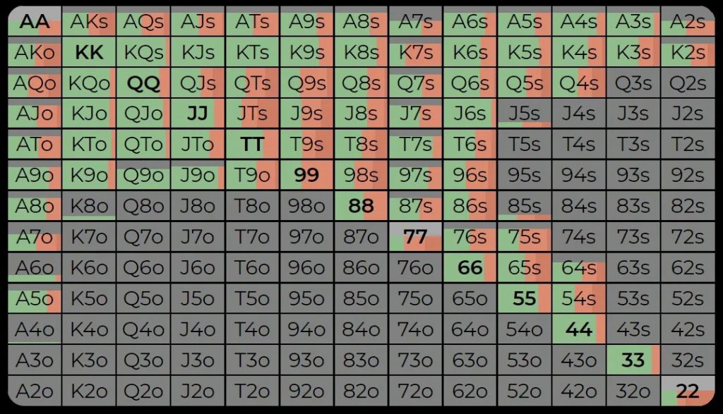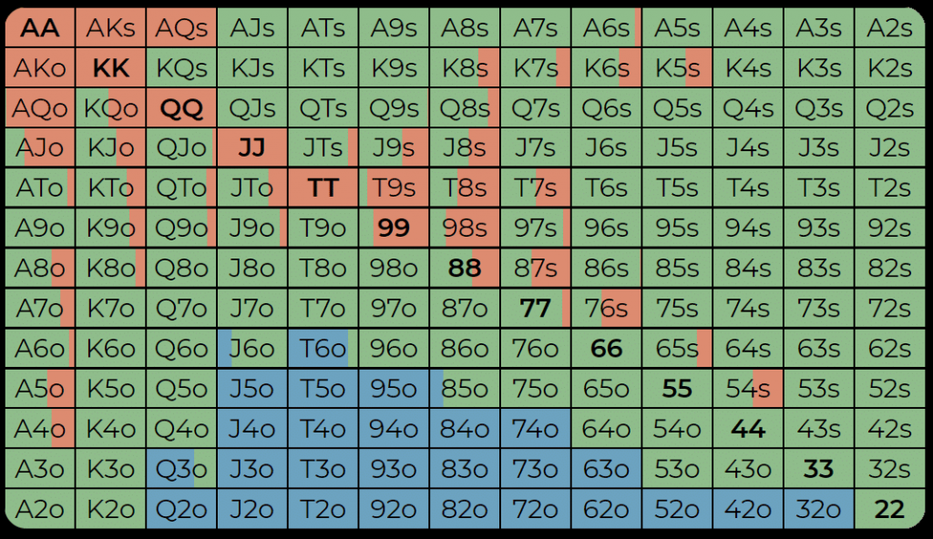 В случае с разномастными Ax, самая слабая комбинация баттона — A9o, в то время как в диапазоне BB есть все комбинации разномастных Ax. Хотя у BB больше комбинаций Ax, его диапазон настолько широк, что доля Ax в его диапазоне составляет всего около 10% по сравнению с 21% в случае с баттоном. У BTN пара будет в два раза чаще, чем у BB.