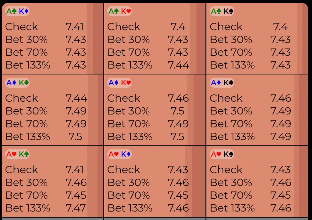 Обратите внимание, что даже худшая Ax-рука в диапазоне CO (справа) – (топ-пара, худший кикер, отсутствие бэкдорного флеш-дро) стоит в аспекте математического ожидания (EV) почти весь банк.