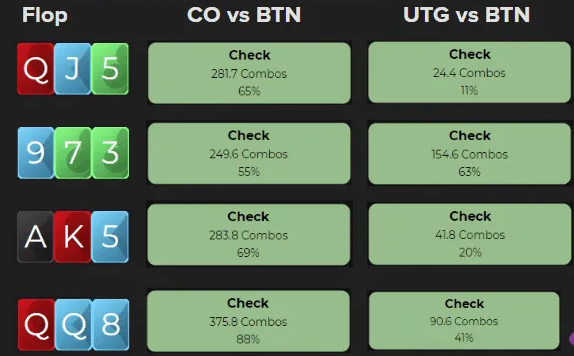 Проверьте любой флоп в солвере (средние флопы, высокие флопы, парные флопы), и вы обнаружите высокую частоту чеков при игре с позиции катоффа против баттона.