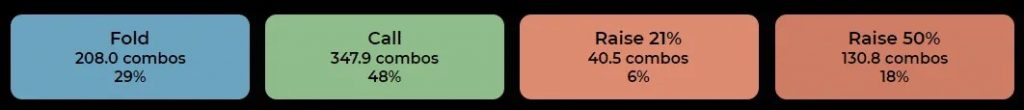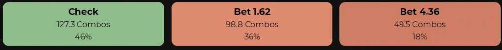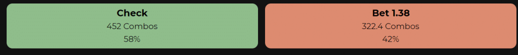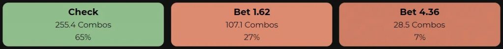 Этот флоп настолько благоприятен для диапазона большого блайнда, что на месте BB солвер выбирает вариант донк-бета почти в половине случаев.