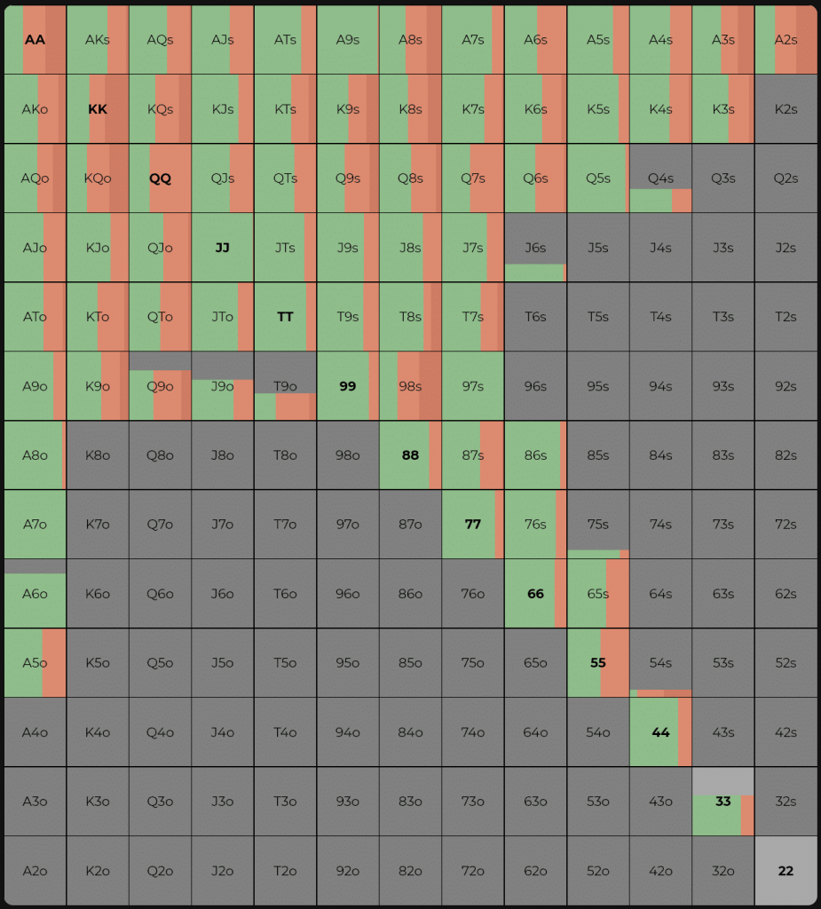 - Поскольку ни один из игроков не сделал 3-бет, их диапазоны более ограничены, чем диапазон коллера с баттона, который включают сильные карманные пары, AQ и даже AK.