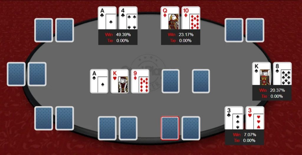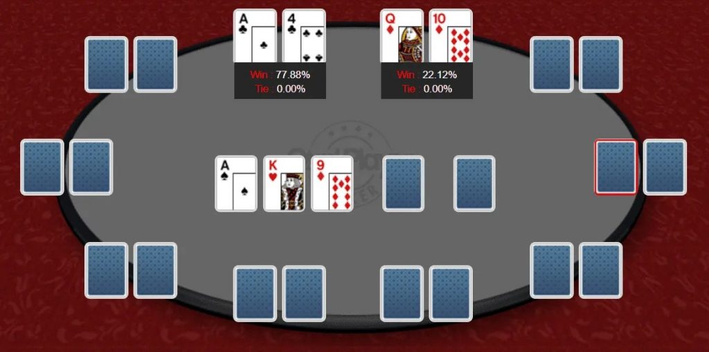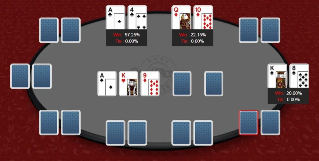Теперь, A4s, лучшая рука на флопе, испытывает снижение эквити примерно на 20%, которое забирает третий игрок.