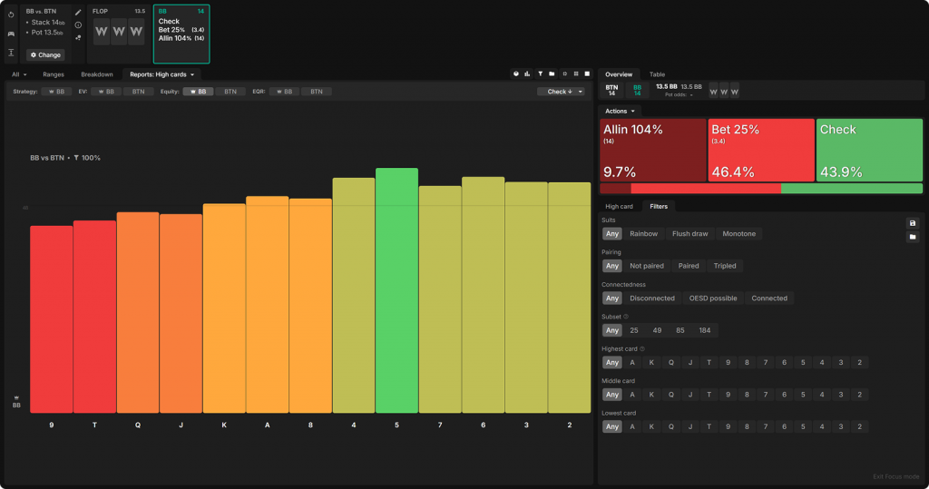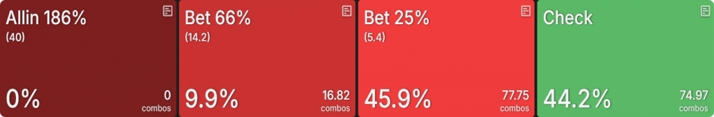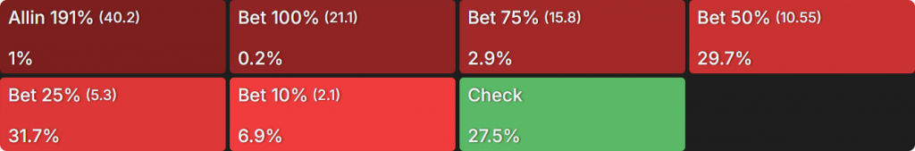 2-хай флоп всего один, поэтому рассмотреть его, чтобы понять это явление, проще всего. В симуляции cEV большой блайнд делает конт-бет примерно в 27% случаев, отдавая небольшое предпочтение сайзингу в 25% банка: