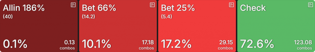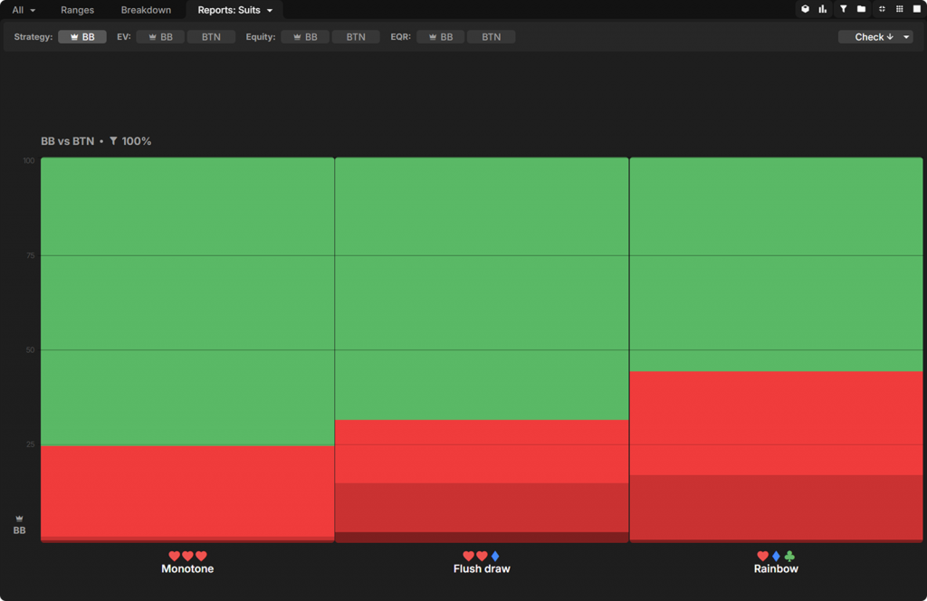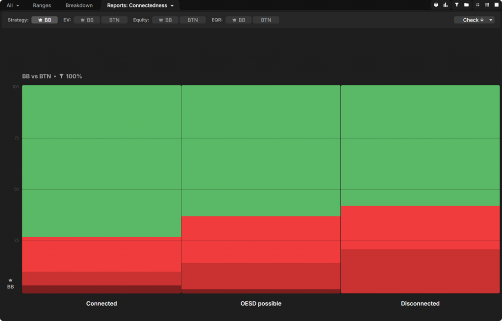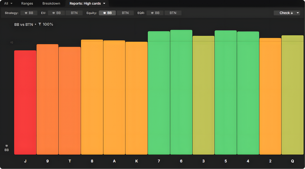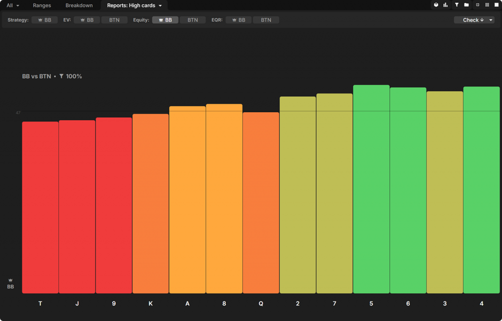 На первый взгляд, премии за риск, кажется, оказывают огромное влияние на постфлоп-стратегию. Большой блайнд чекает примерно 64% своего диапазона в симуляции ICM и только 28% в эквиваленте Chip EV.