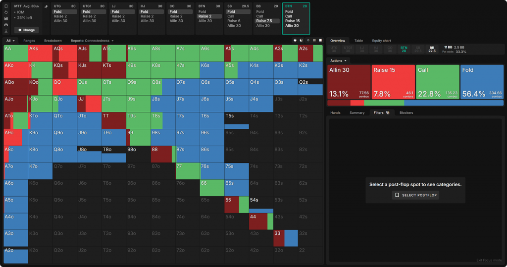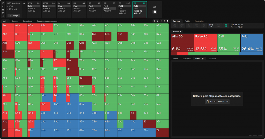 Ответ BTN на 3-бет BB (7,5bb), 30bb, ICM (25% поля):