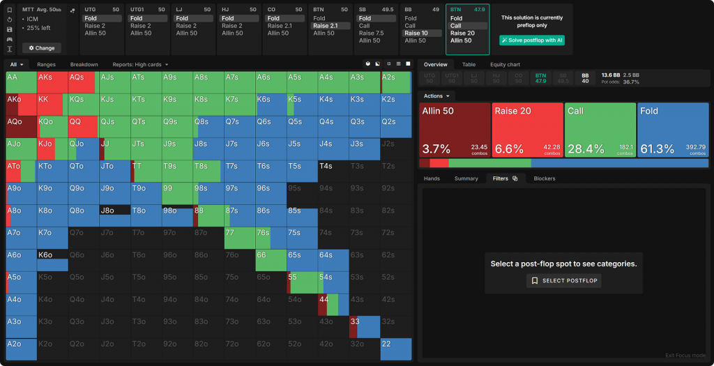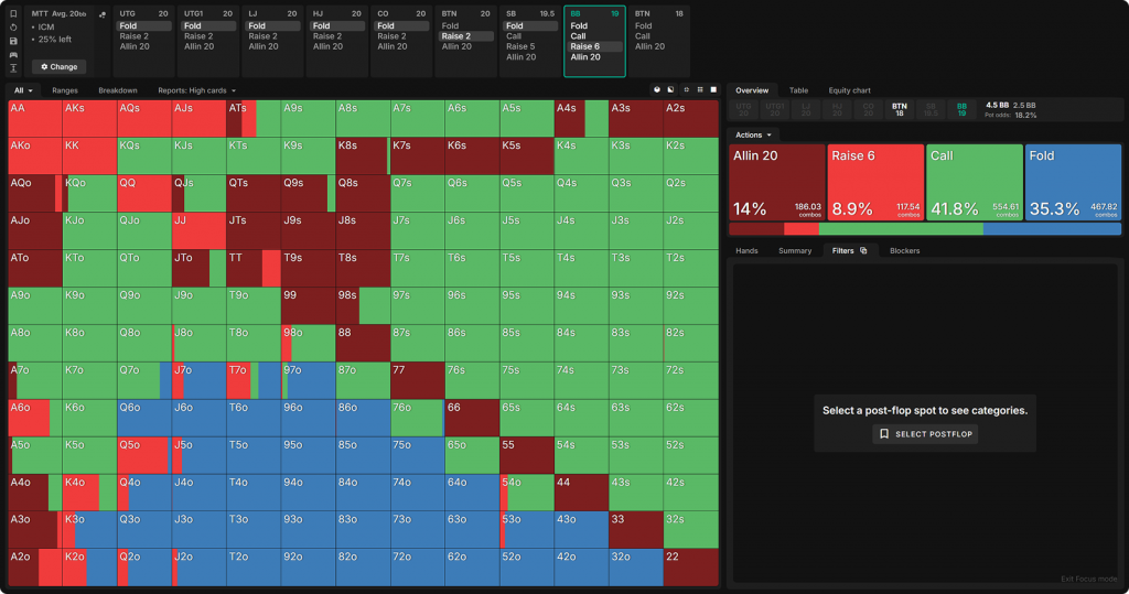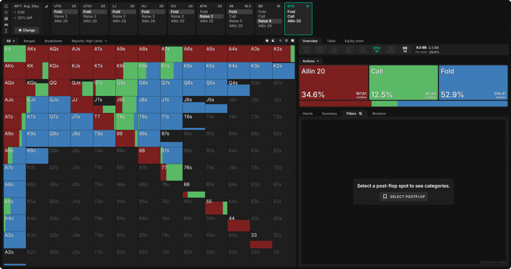 Чтобы оставить себе пространство для фолда в ответ на олл-ин, BB использует меньший размер 3-бета: 6 больших блайндов вместо 7,5 больших блайндов, сайзинг, который он использует при глубине 30 больших блайндов. Несмотря на привлекательные шансы на колл, BTN довольно часто пушит против 3-бета. Довольно много рук достаточно сильны, чтобы пойти олл-ин всего на 20 больших блайндов, и ICM сильно стимулирует даже такие сильные руки, как KK, нацелиться на фолд-эквити и минимизировать дисперсию, которые сопутствуют пушу. Единственная сильная рука, которая постоянно выбирает «жадную» линию ловушки посредством колла, — это AA, поскольку при таком низком SPR AA могут спокойно сыграть на стек на любом флопе. Большая часть диапазона защиты BTN против 3-бета — это коллы по шансам банка с руками из нижней части диапазона пуша и/или верхней части диапазона фолда.