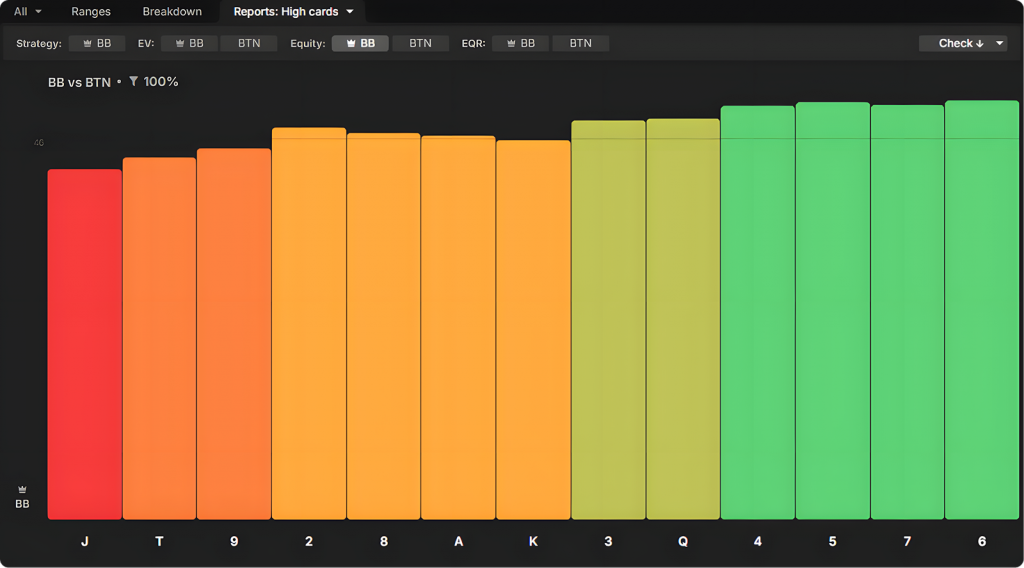 Давайте рассмотрим некоторые из лучших рук в диапазоне большого блайнда: KK, QQ, JJ, AK и AQ (на таком сухом флопе лучшие непарные руки довольно сильны — например, у AQ более 60% эквити). Эти руки достаточно сильны, чтобы оставаться впереди, когда баттон коллирует, но также достаточно уязвимы, чтобы, если баттон соберет живую пару на терне, это могло стоить этим рукам банка.